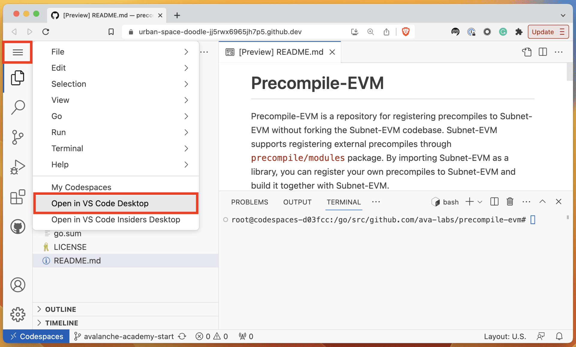 The first time you switch, you will be asked to install the Codespaces extension and connect VS Code to you GitHub account, if it is not already connceted.